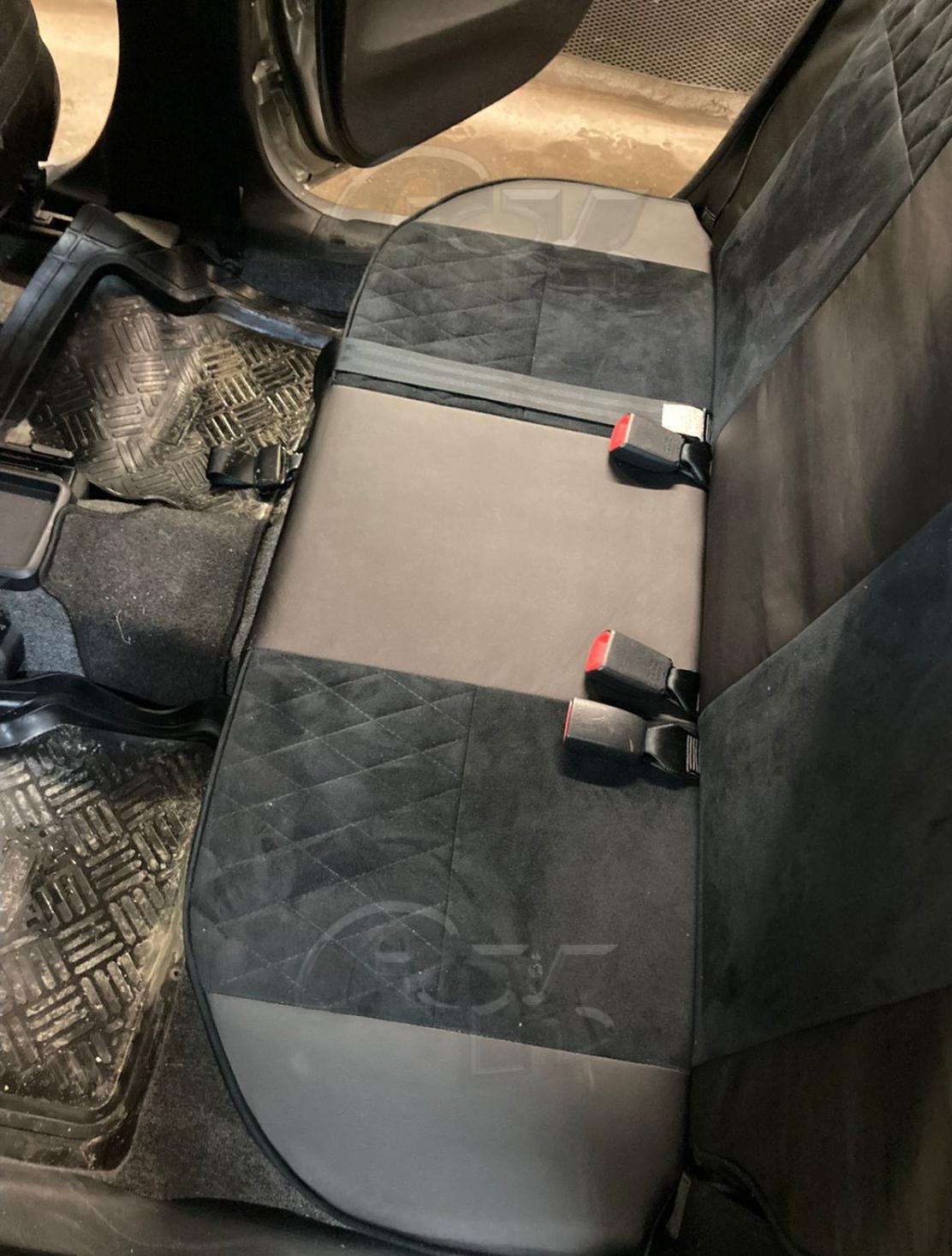 Чехлы предназначены для автомобиля, где передние сиденья простые. Передние подголовники литые  со спинками, встречается версия салона с  раздельными  подголовниками (необходимо уточнение). Второй ряд сплошной лавкой, спинки второго ряда без подголовников.